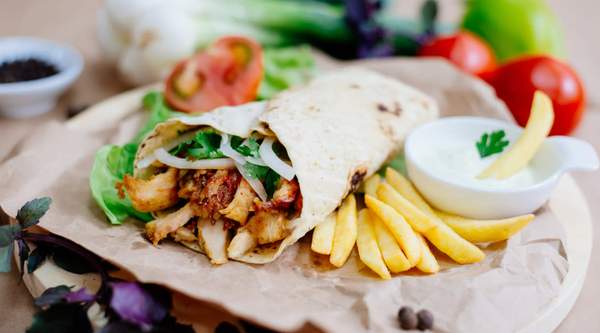 Pan de pita especial relleno de carne, ensalada, queso y salsas