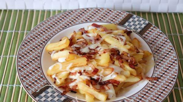 Patatas fritas, queso, kebab, salsa yogurt y mozzarella