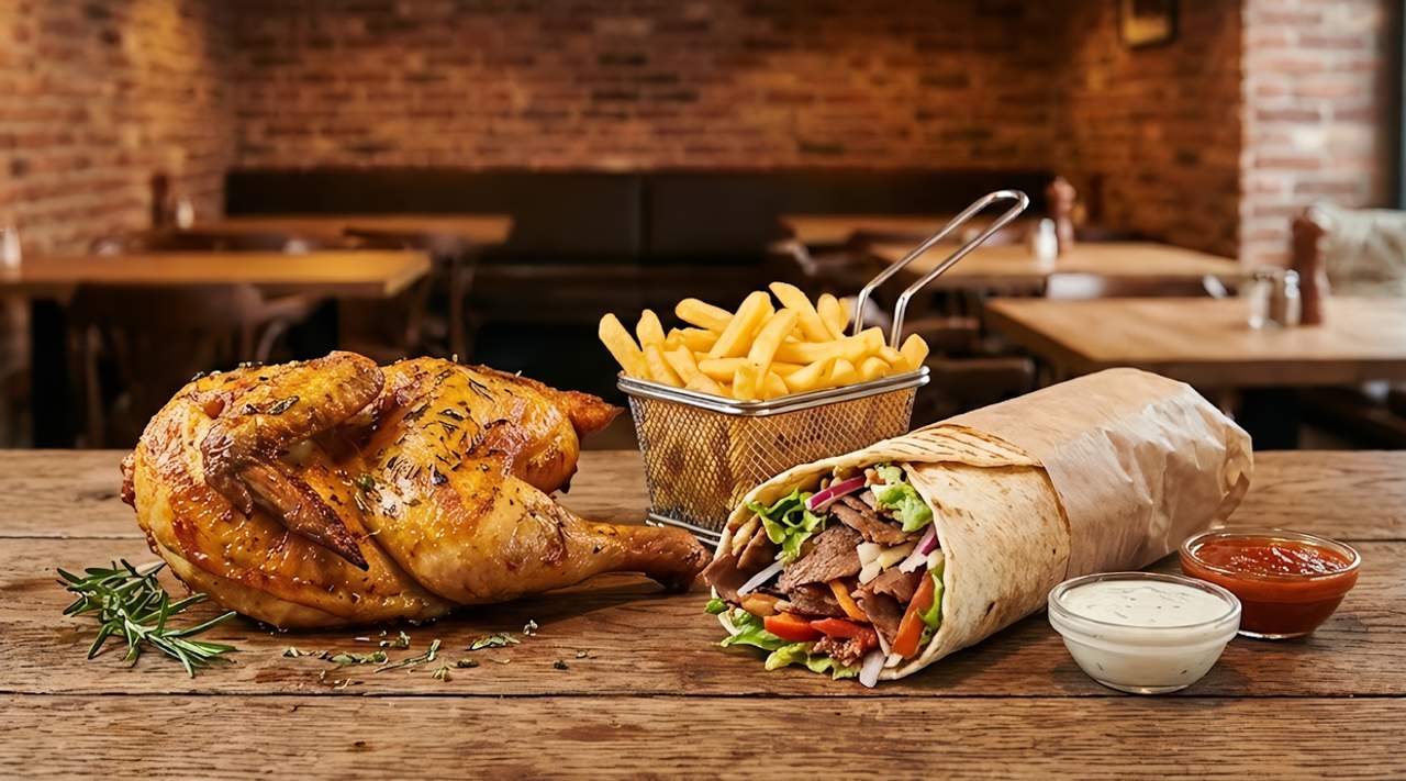 Carne a la parrilla en pan de pita, servida con patatas fritas en el interior