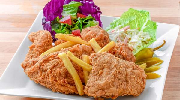 A elegir entre 2 piezas de pollo apanado o 1/4 de pollo asado, ensalada, arroz, frijoles, huevo frito y arepa