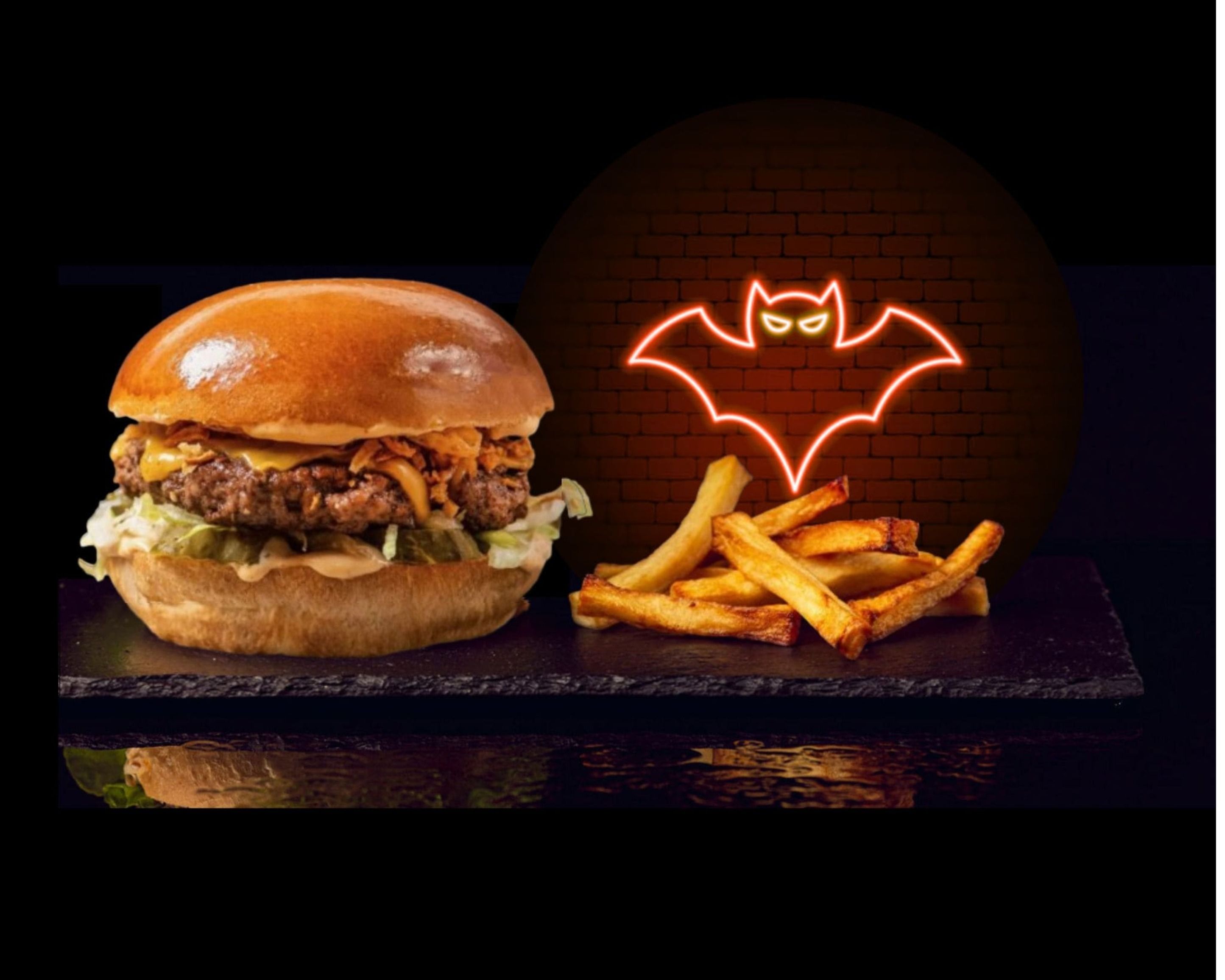 Burger de CARNE, salsa BBQ Smokehouse, queso american, cebolla, ketchup y mayonesa.