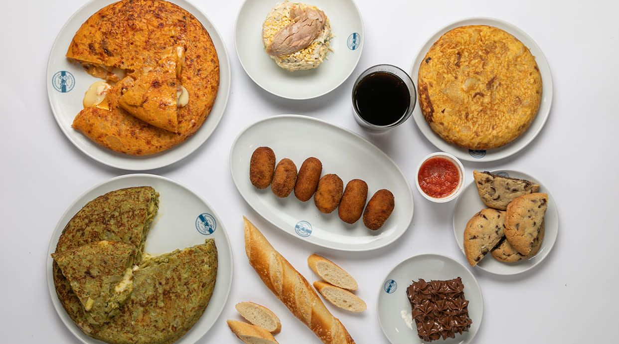 Tortillas medianas (2 uds.), croquetas (6 uds.), entrante, embutido y 2 barras de pan con 1 tomate