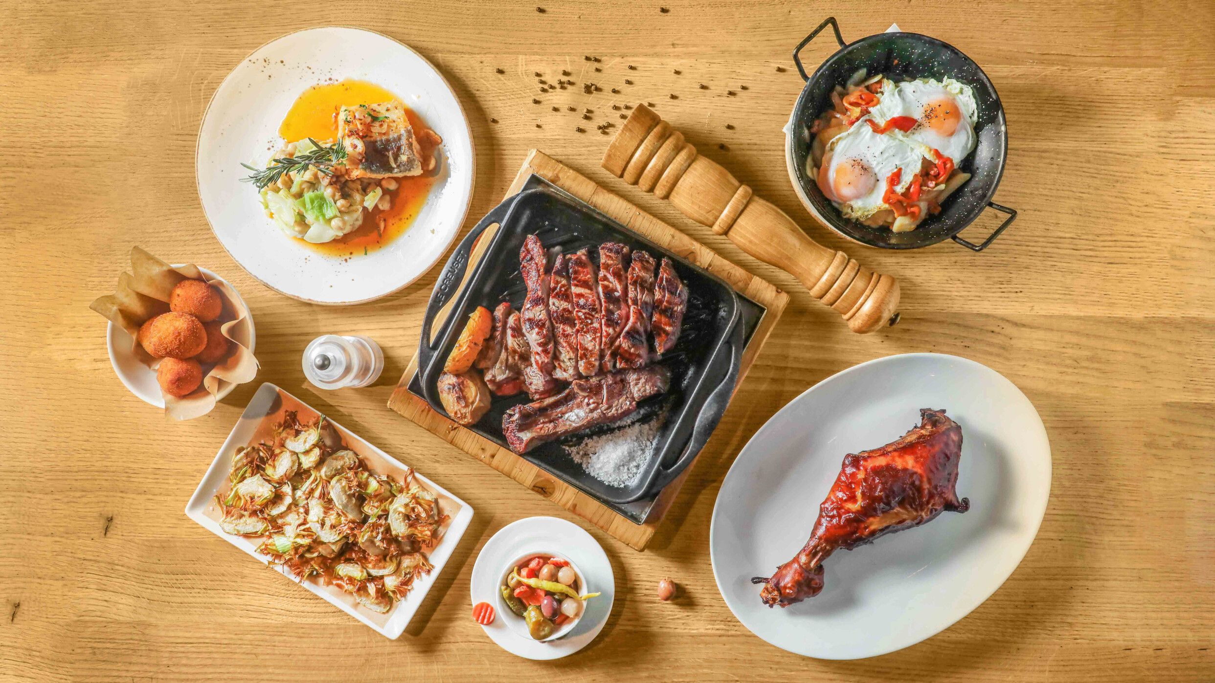 Pollo asado entero con patata al caliu, manzana asada, salsa alioli, ensaladilla rusa, escalivada a la brasa de carbón y 6 croquetas