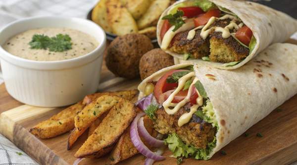 Wrap vegetariano relleno de falafel crujiente, vegetales y salsa