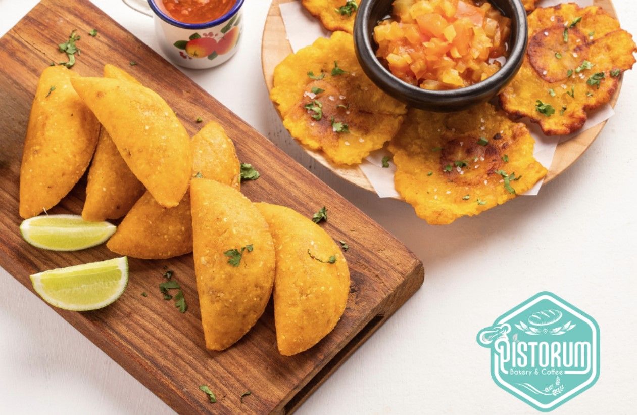 Acompañado con arepa de maíz blanco y moneditas de patacón.