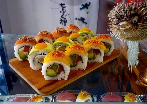 Langostino en tempura, mango, queso crema, cubierto de aguacate y salsa de mango con chili dulce