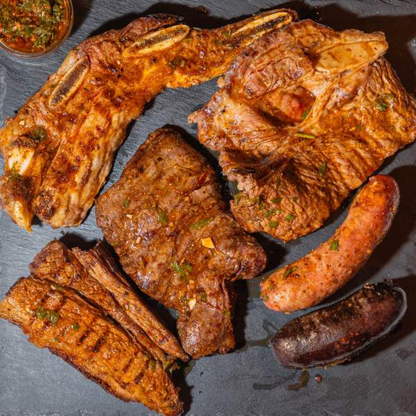 1 kg de asado (chorizo, morcilla, vacio, entraña, costillas y lomo), 4 empanadas de carne y una porción de patatas fritas