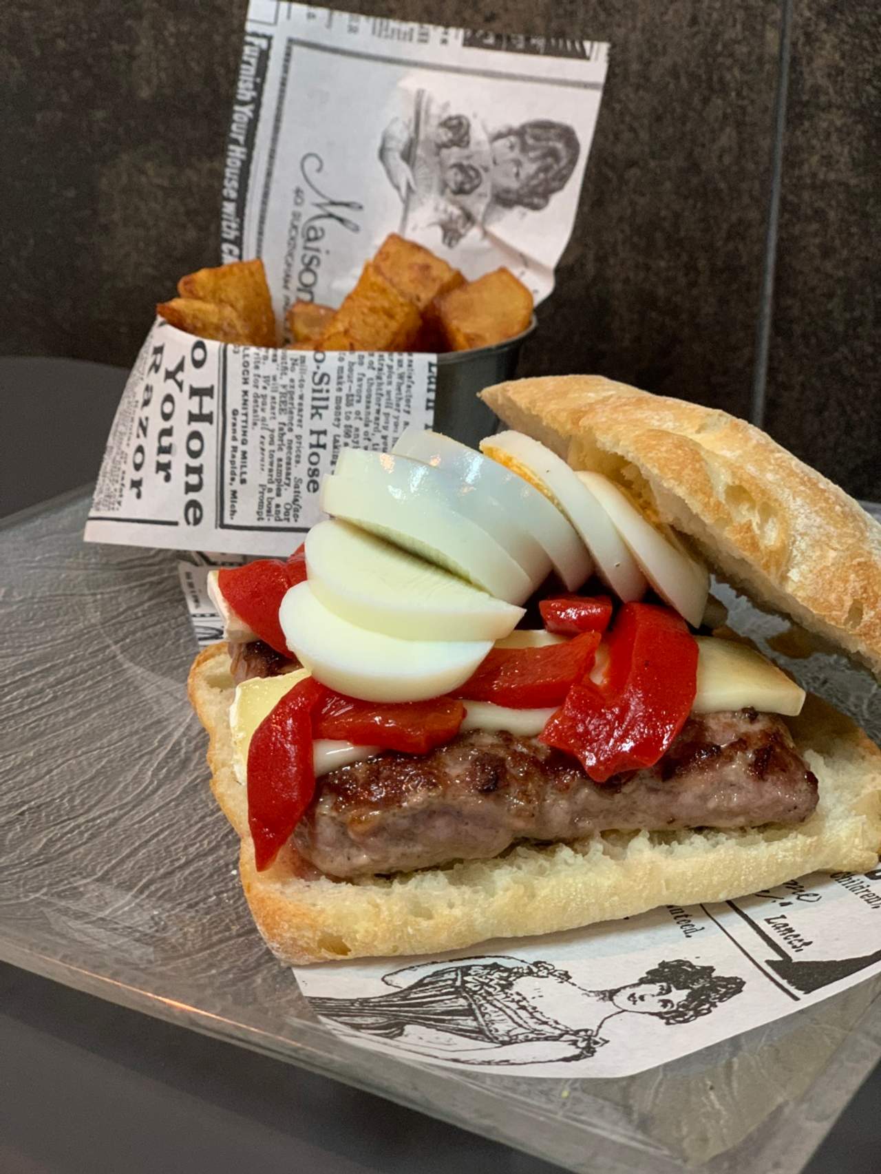 Burguer 170 gr 100% vedella, mesclum (varietat d'enciams superiors), sobrassada Menorca, mel i formatge de Maó.
