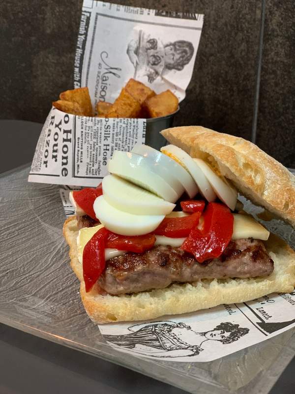 Burguer 170 gr 100% vedella, mesclum (varietat d'enciams superiors), formatge brie, pebrot vermell i ou dur.