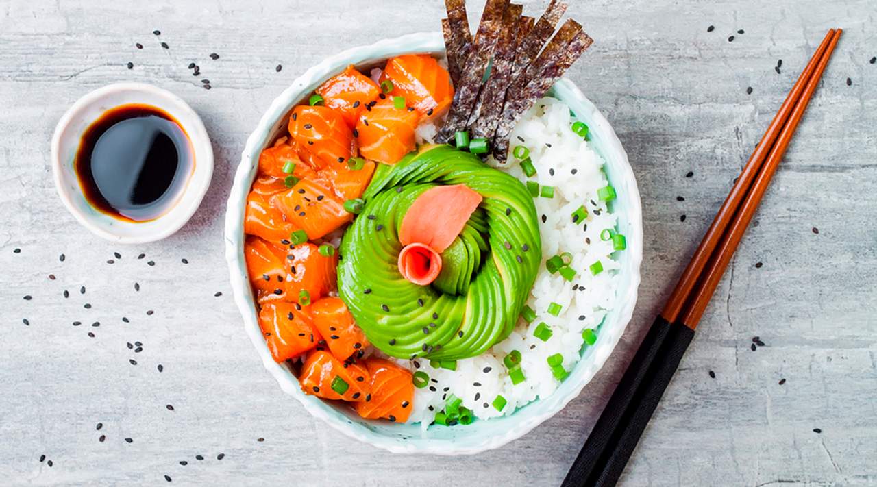 128 - Poke aguacate, Salmón, Edamame, Tomate y arroz de base