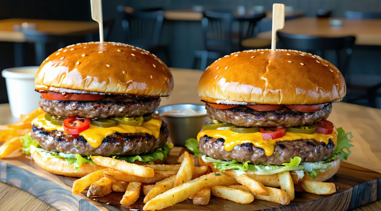 Doble smash, queso cheddar, pepinillo encurtido y nuestra salsa burger. Fresca, cremosa, con contraste perfecto