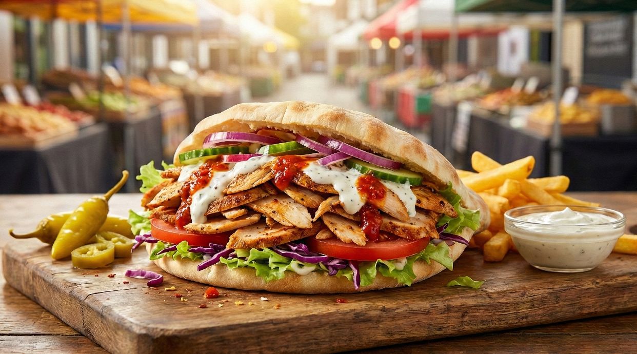 Pan de pita con carne a elegir, lechuga, cebolla, tomate y salsa
