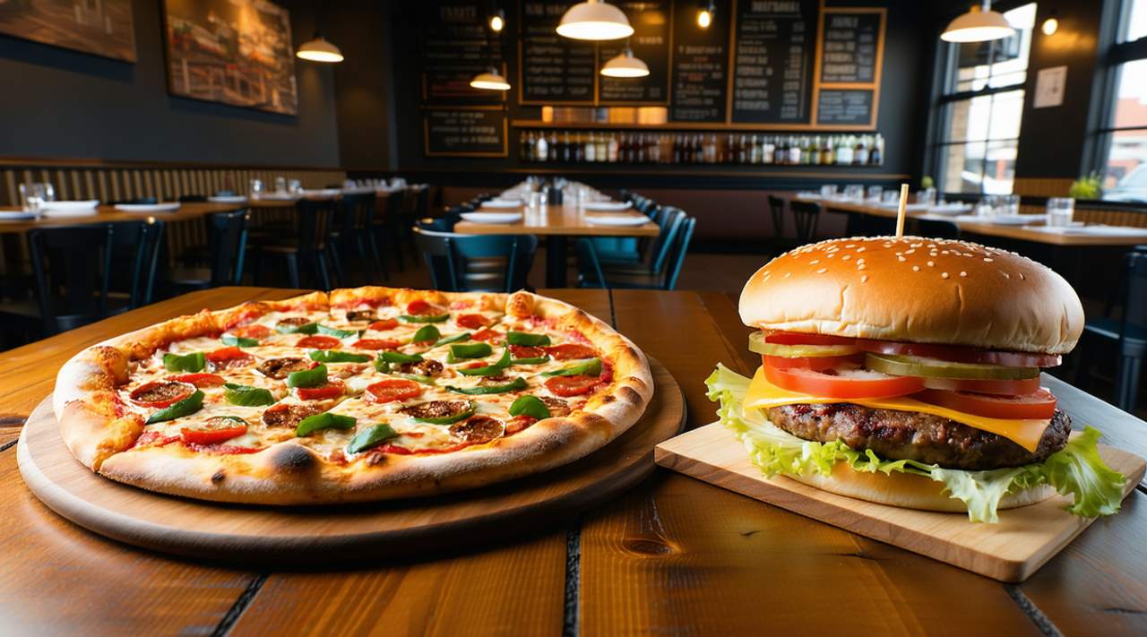 Hamburguesa de carne con queso cheddar, lechuga, tomate, cebolla y salsa de hamburguesa