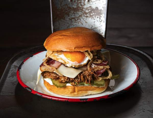 Carne de cerdo (200 g.), desmigado a baja temperatura, salsa de la casa, lechuga, tomate, cebolla encurtida, queso edam y bacon