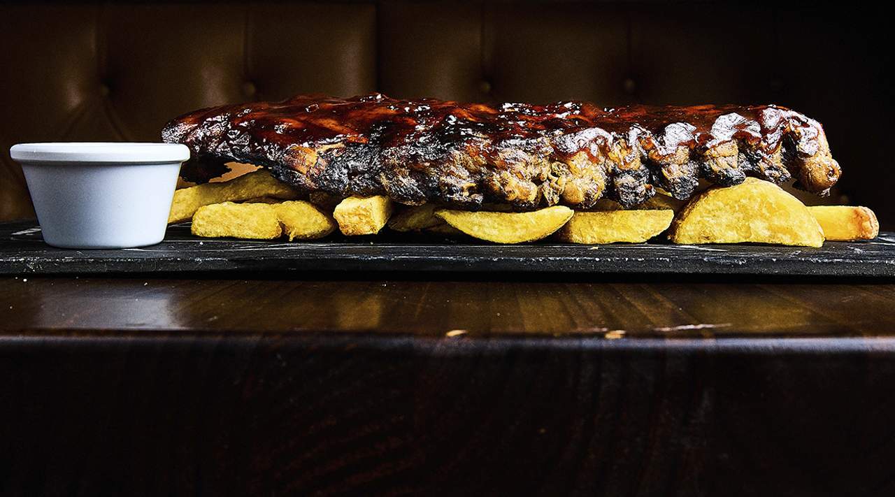 Costilla de cerdo al horno. Con patatas, croquetas (2 uds.) y huevo frito