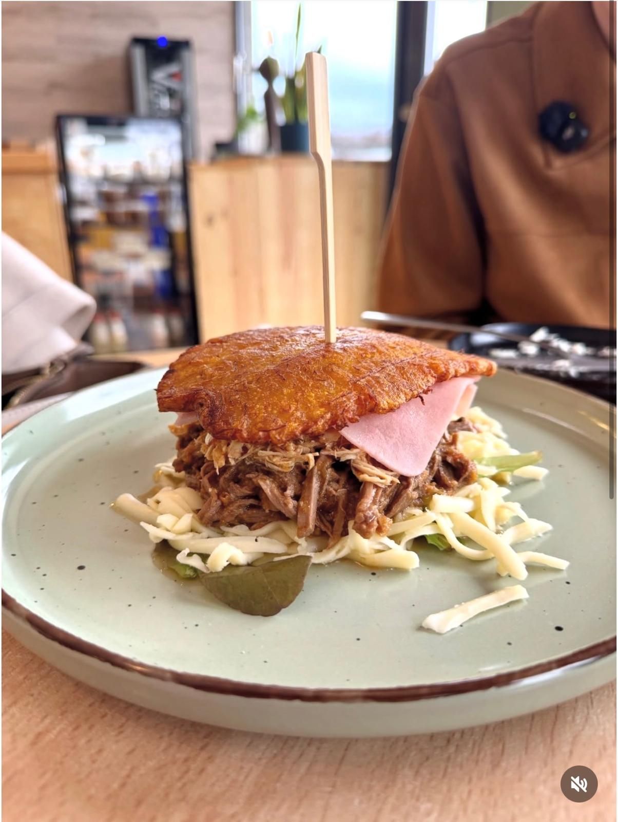 Base de plátano macho maduro frito, relleno de lechuga, tomate, jamón, queso gouda, mostaza, salsa de tomate y salsa tártara