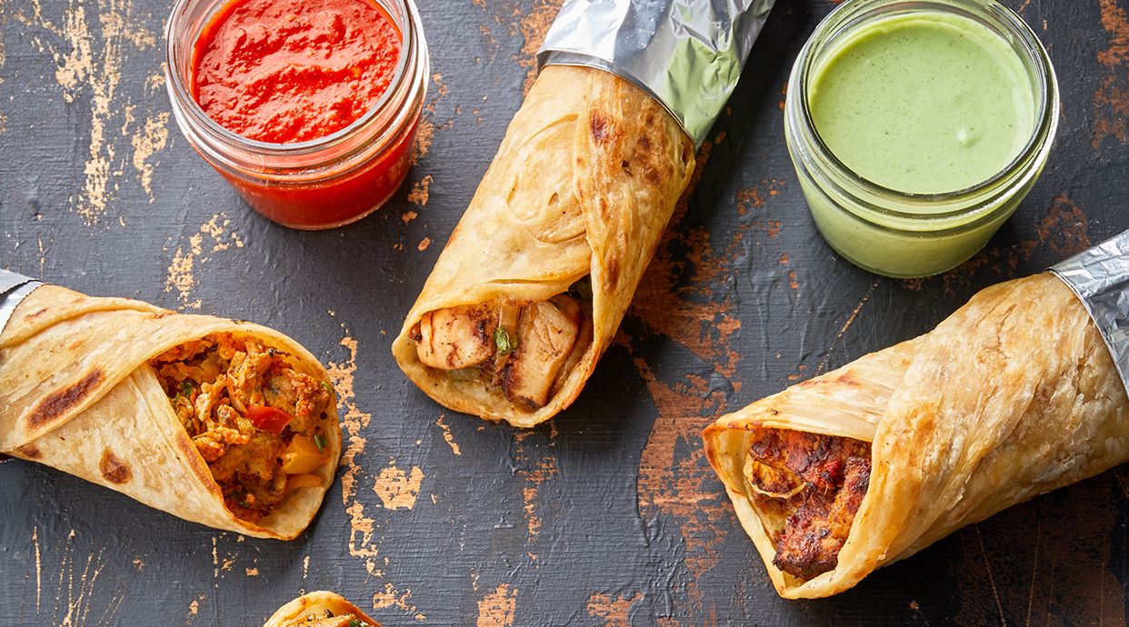 Pan de pita, pollo y salsas