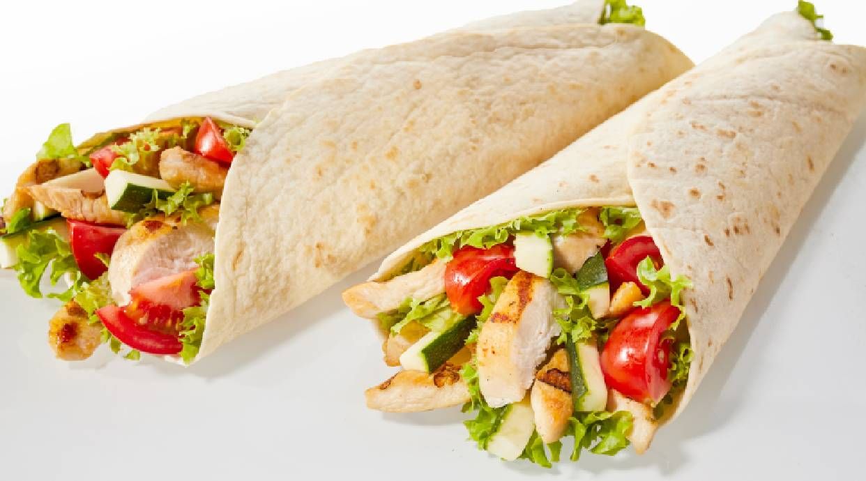 Pan de pita, pollo, ensalada y salsas