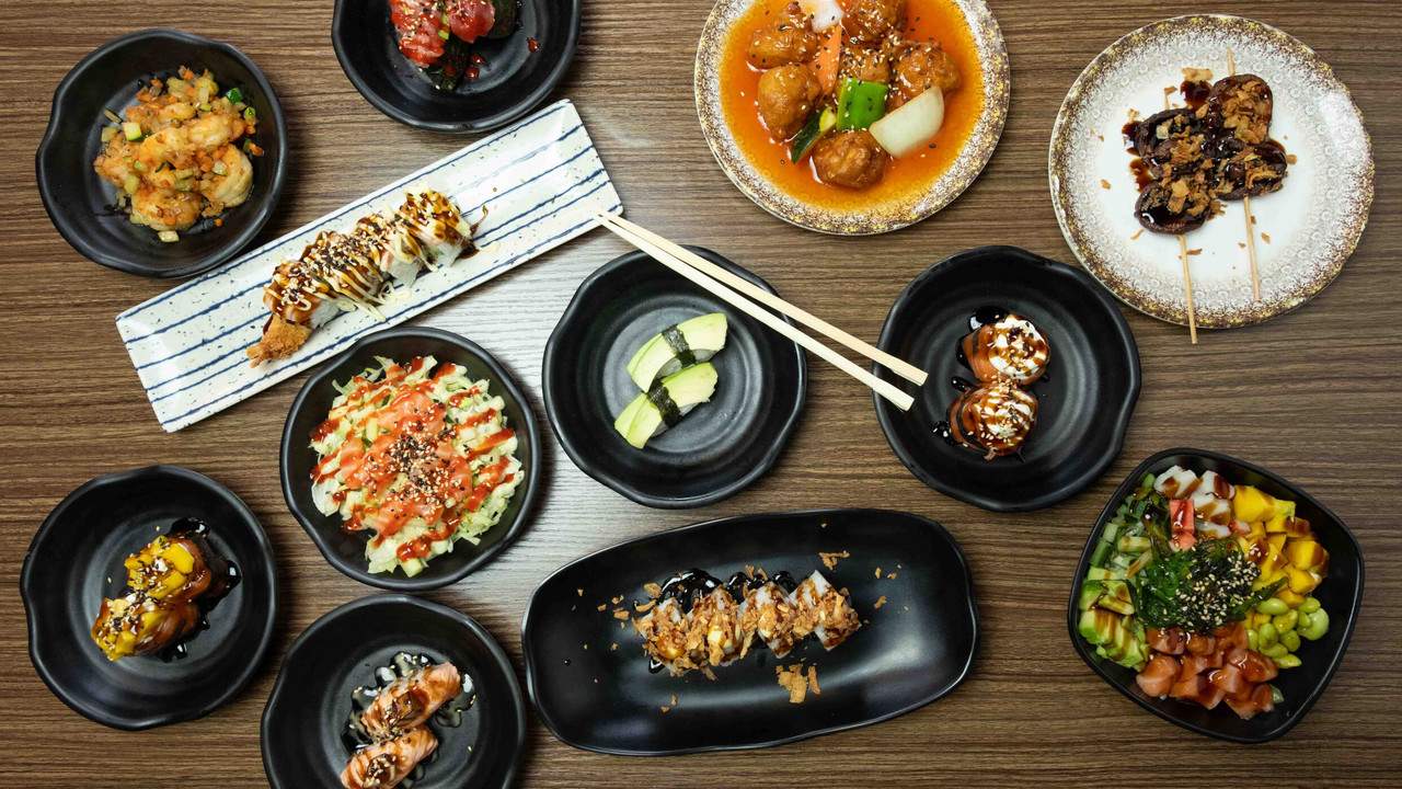 4 Nigiris de salmón, 4 nigiris de atún, 4 nigiris de ebi, 8 makis de salmón, 8 makis de atún, 8 makis de aguacate, 4 crispy pollo, 4 uramakis de salmón y aguacate, 5 shao mai y 2 katsudon con teriyaki