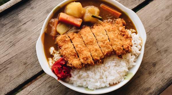 Delicioso arroz acompañado de curry japonés suave con ebi fry