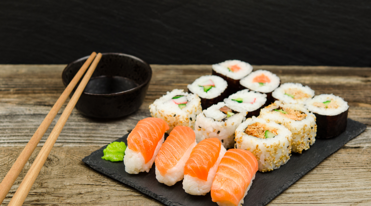 Arroz de sushi, salmón y salsa teriyaki,sesémos y ceboino.
