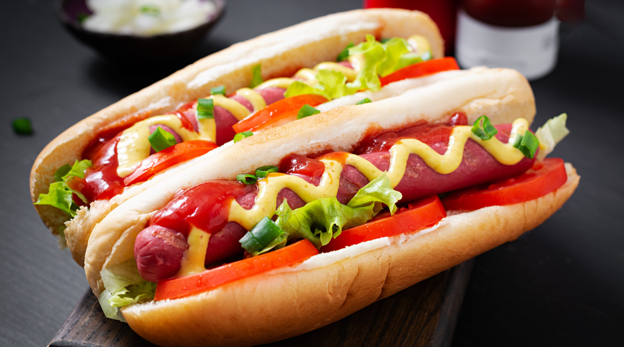 Pan, salchicha frankfurt, cebolla frita, mostaza, ketchup, mayonesa