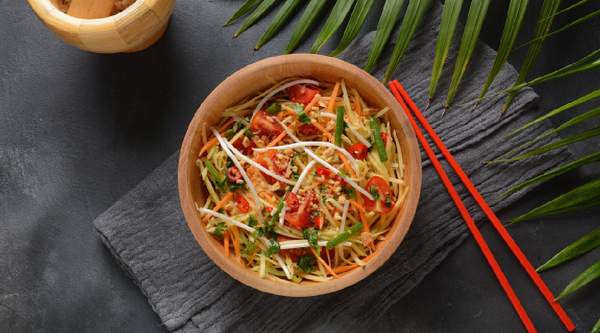 Una refrescante ensalada con una mezcla de vegetales frescos y un aderezo especial chino, ligera y llena de sabor
