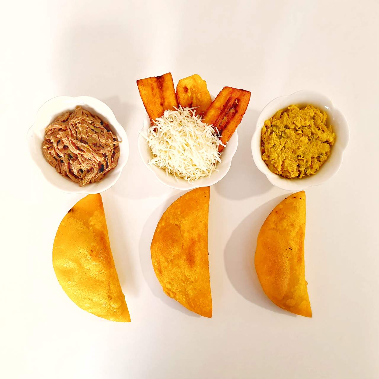 100 % Harina de maiz sin gluten. "LA FAVORITA #1" Rellena de Carne de ternera desmechada, Queso blanco latino, Alubias negras guisadas ( caraota) y platano macho maduro.