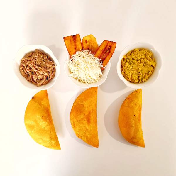 100 % Harina de maiz sin gluten. Rellena de Carne de ternera desmechada, queso blanco latino y tajadas de plátano maduro.