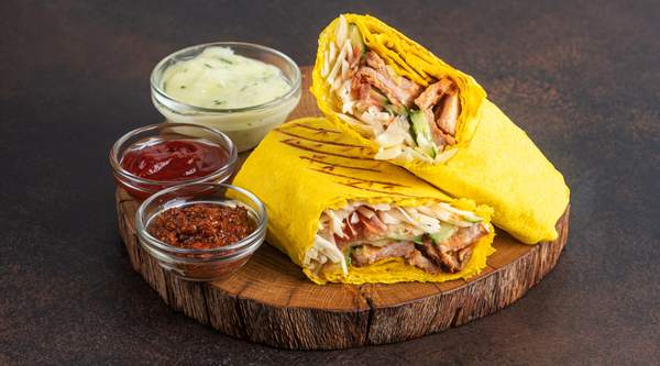 Ternera, pollo o mixto, lechuga, tomate y cebolla, col lombarda, maíz, olivas, salsa yogurt y picante