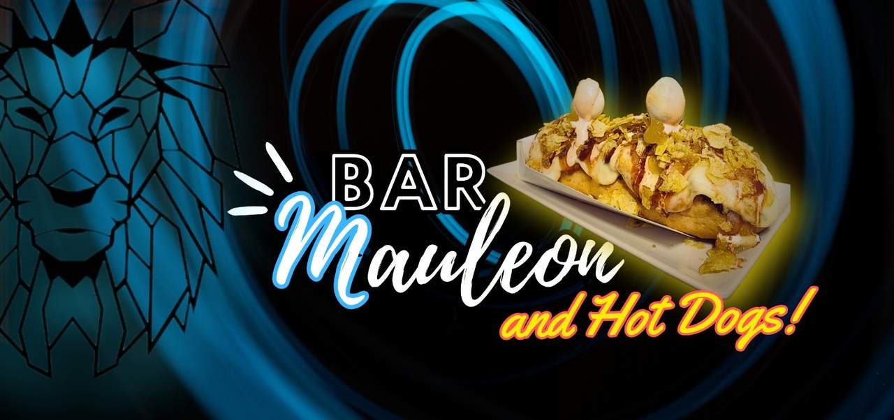 Perrito caliente con carne desmechada, cebolla caramelizada, salchicha, bacon, queso mozzarella, cebolla crujiente, patatas rotas, huevo de codorniz y salsa de piña, rosa, kétchup, barbacoa, mayonesa y mostaza