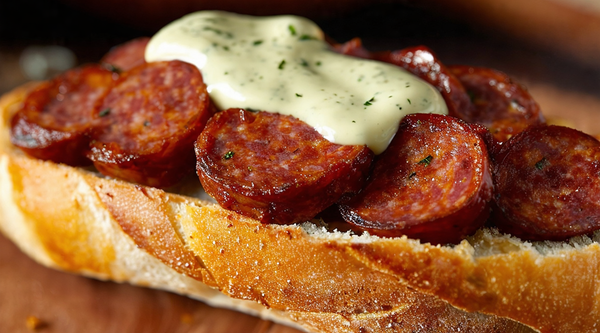 Chorizo cocinado en sidra, pan rústico y un toque de pimientos asados