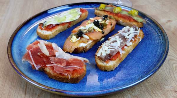 Una rebanada de pan tostado, cubierta con una capa de tomate fresco rallado y aceite de oliva, y una capa de jamón ibérico de alta calidad.