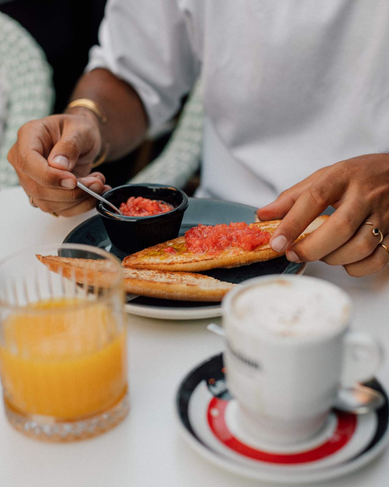 Café o infusión, pan rústico tostado, tomate natural rallado y aceite de oliva