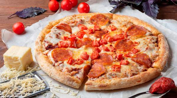 Tomate, mozzarella, chorizo picante, jamón York, setas y aceitunas