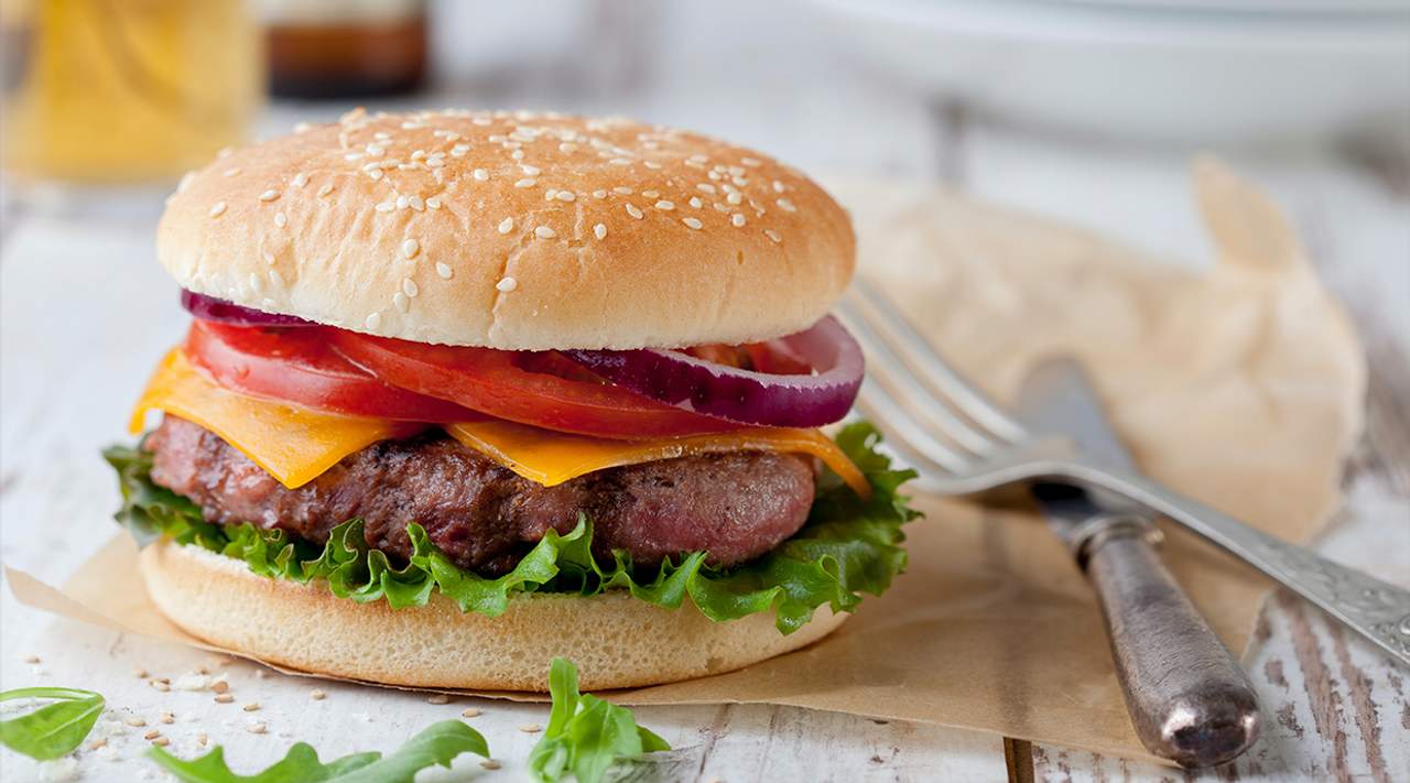 Carne mixta (80 g.), queso, bacon, lechuga, tomate y cebolla con patatas y bebida