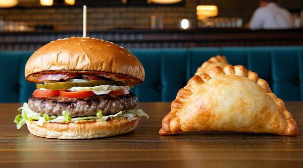 Carne Angus casera con doble cheddar, cebolla crunchy y aderezo hidden (mayonesa alioli y chimichurri)