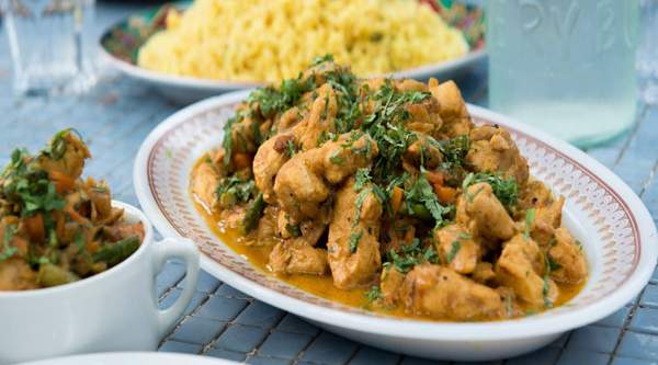 Curry muy popular a base de nata fresca, pasas sultanas, cocos y almendras. Un plato cremoso con hierbas y especias poco picantes
