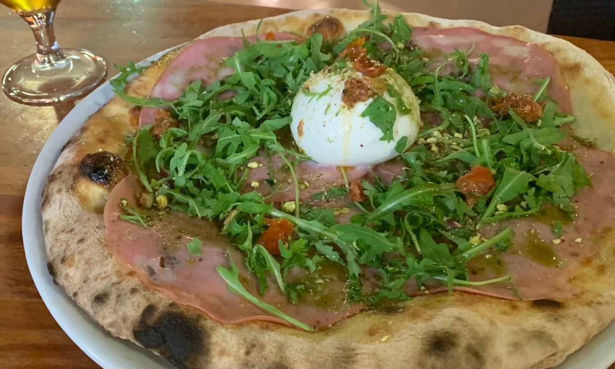 Mozzarella, burratina, mortadela, rúcula, pistacho, tomate seco, aceite de albahaca y piñones