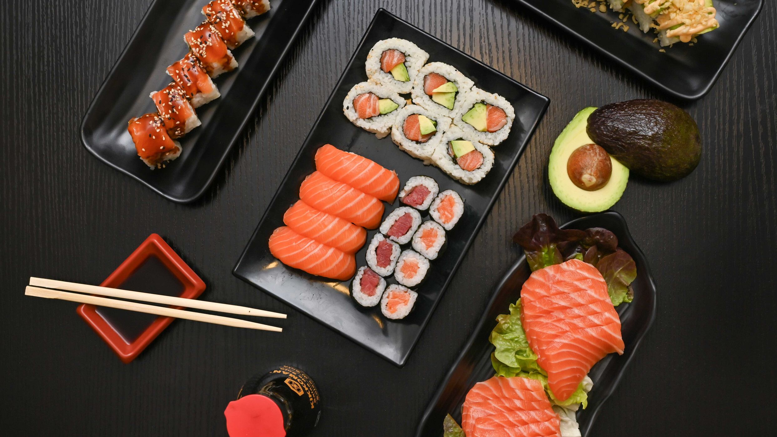 Nigiri salmón (4 uds.), maki salmón (4 uds.), maki atún (4 uds.) y California salmón y aguacate (6 uds.)