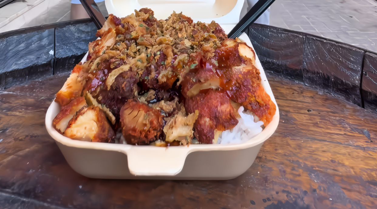 Bebida, tiramisú y el og grande (arroz blanco suave, bañado con nuestra salsa tailandesa casera, coronado con filete de pollo empanizado al estilo crousty, cebolla frita crocante y un toque fresco de perejil).¡Remátalo con la salsa de tu elección!