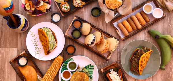 Combinado de seis mini arepas de carne mechada, pollo guisado, reina pepiada, domino, verduras y pernil