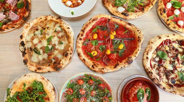 Tomate San Marzano D. O . P, mozzarella fior di latte, salami Napoli, jamón cocido, champiñones, alcachofas, pan crujiente de aceituna negra, AOVE y albahaca.