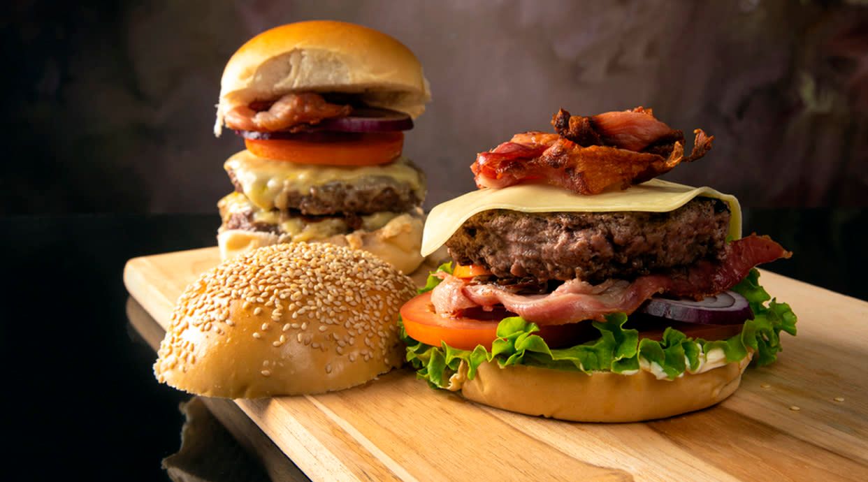 Burger, queso cheddar, provolone y salsa de queso, bacon, lechuga francesa, tomate cebolla confitada y mayonesa, en pan brioche acompañada de patatas fritas