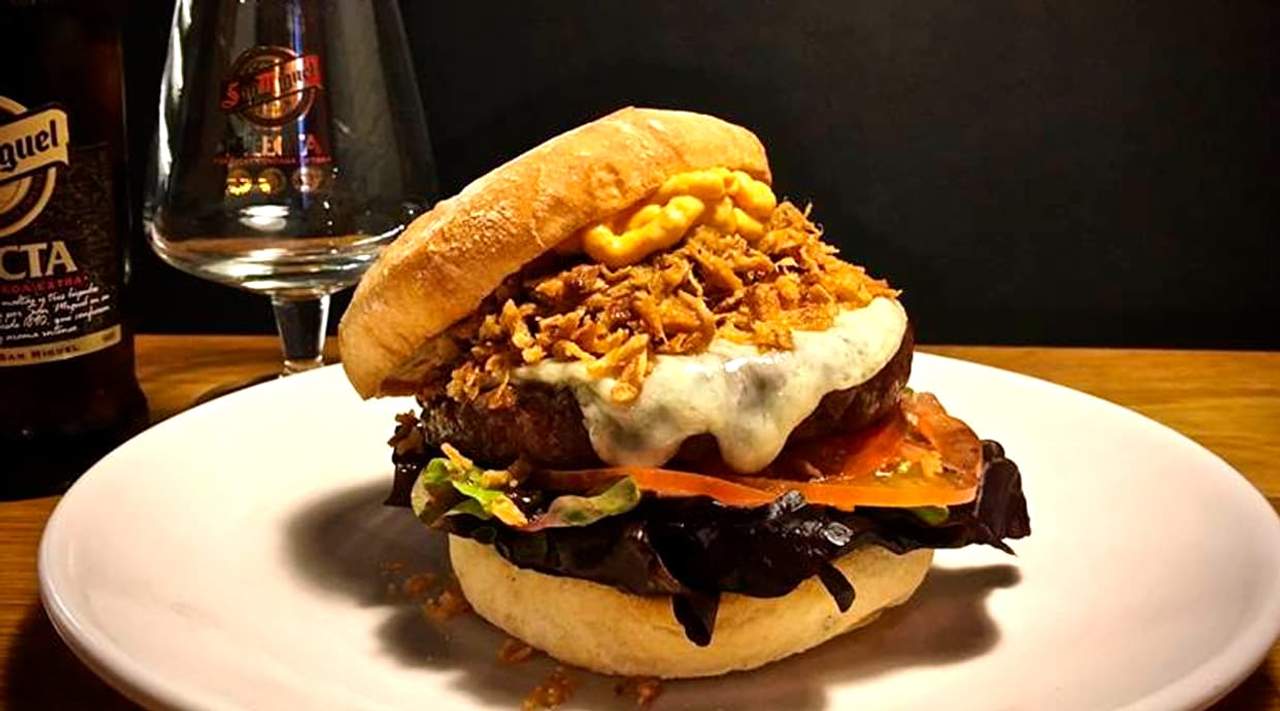 Carne a elegir, mayonesa de encurtidos, rúcula, queso manchego, oreja picante a la plancha y cebolla crujiente