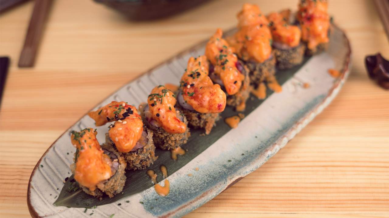 Uramaki tempurizado de atún, aguacate y dinamita cubierto de chili mayo y cebollino.