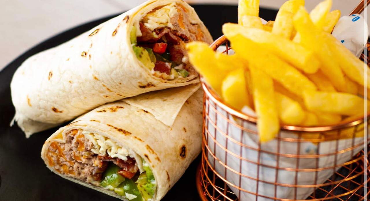 Burrito de carne de ternera con salsa miel mostaza y agridulce . tomate, cebolla y lechuga