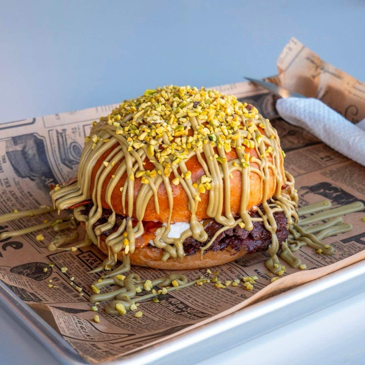 Doble pattie (90 g.) de carne de angus, doble de bacon ahumado crispy, doble queso cheddar fundido, burrata, salsa de pistacho y grano de pistacho