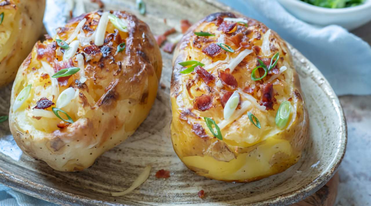 Patata horneada a baja temperatura, bacon, queso gratinado y salsa a elegir