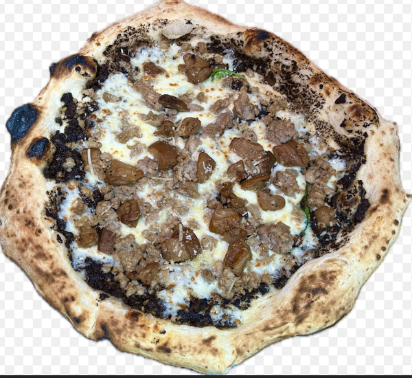 Mozzarella, trufa negra, champiñones, butifarra, parmigiano reggiano 24 meses, aceite, albahaca y pimienta negra